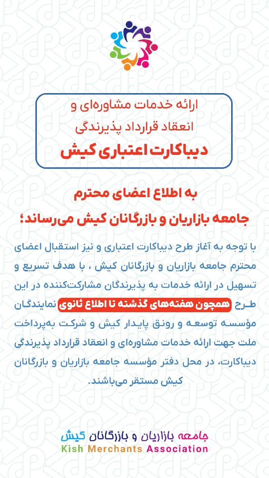 با توجه به آغاز طرح «دیباکارت اعتباری کیش» ، بمنظور تسریع و تسهیل در ارائه خدمات به پذیرندگان مشارکتکننده در این طرح و با عنایت به استقبال اعضای محترم جامعه بازاریان و بازرگانان کیش از این طرح ، همچون هفته های گذشته تا اطلاع ثانوی ، نمایندگان مؤسسه توسعه و رونق پایدار کیش و شرکت بهپرداخت جهت ارائه خدمات مشاورهای و انعقاد قرارداد پذیرندگی دیباکارت، در محل دفتر مؤسسه جامعه بازاریان و بازرگانان کیش مستقر میباشند.